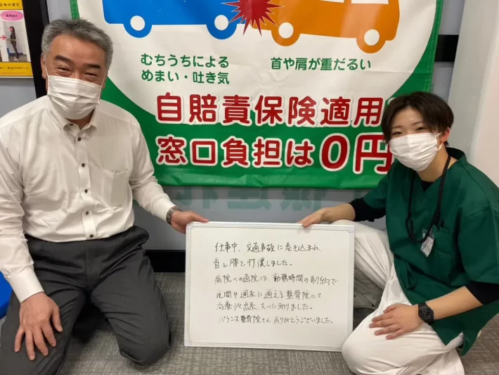 仕事中、交通事故に巻き込まれ首と腰を打撲しました。 病院への通院は勤務時間の制約で夜間や週末に通える整骨院にて治療が出来、大いに助かりました。 バランス整骨院さんありがとうございました。
