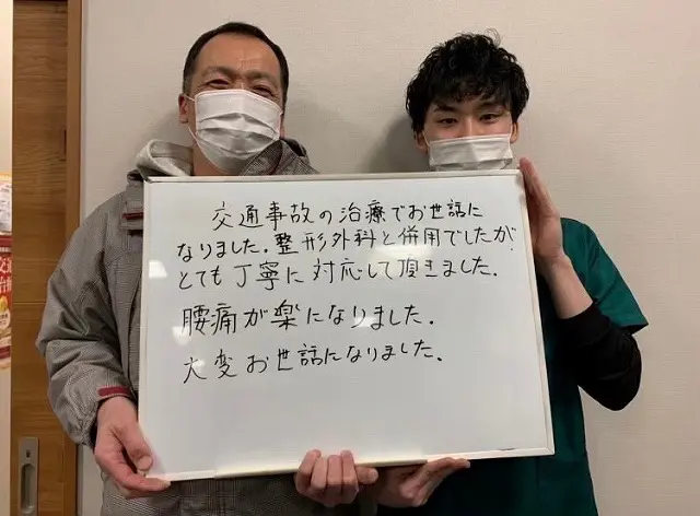 交通事故の治療でお世話になりました。整形外科と併用でしたがとても丁寧に対応して頂きました。腰痛が楽になりました。 大変お世話になりました。
